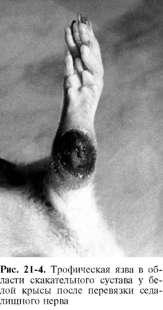 7. Вещества, образующиеся в мышечном волокне и концевой пластинке, поступают транссинаптически в обратном направлении в терминаль и далее с ретроградным аксоплазматическим током 7 в тело нейрона - к ядру 8, в перикарион 9, к мембране дендритов 10. Некоторые из этих веществ могут поступать из дендритов (Д) транссинаптически в другой нейрон через его пресинаптическое окончание (ПО) и из этого нейрона далее в другие нейроны. Между нейроном и мышцей происходит постоянный обмен веществами, поддерживающими трофику, структурную целостность и нормальную деятельность обоих образований. В этом обмене принимают участие глиальные клетки (Г). Все указанные образования создают регионарную трофическую систему (или трофический контур) изменения клеток-реципиентов (патотрофогены, по Г.Н. Крыжановскому). Такие вещества синтезируются, например в эпилептических нейронах - поступая с аксоплазматическим током в другие нейроны, они могут индуцировать у этих нейронов-реципиентов эпилептические свойства. Патотрофогены могут распространяться по нервной системе, как по трофической сети, что является одним из механизмов распространения патологического процесса. Патотрофогены образуются и в других тканях. Дистрофический процесс в денервированной мышце. Синтезируемые в теле нейрона и транспортируемые в терминаль с аксоплазматическим током вещества, выделяются нервным окончанием и поступают в мышечные волокна (см. рис. 21-3), выполняя функцию трофогенов. Эффекты нейротрофогенов видны из опытов с перерезкой двигательного нерва: чем выше произведена перерезка, т.е. чем больше сохранилось трофогенов в периферическом отрезке нерва, тем позднее наступает денервационный синдром. Нейрон вместе с иннервируемой им структурой (например, мышечным волокном) образует регионарный трофический контур, или регионарную трофическую систему (см. рис. 21-3). Если осуществить перекрестную реиннервацию мышц с разными исходными структурно-функциональными характеристиками (реиннервация «медленных» мышц волокнами от нейронов, иннервировавших «быстрые» мышцы, и наоборот), то реиннервированная мышца приобретает в значительной мере новые динамические характеристики: «медленная» становится «быстрой», «быстрая» - «медленной». В денервированном мышечном волокне возникают новые трофогены, которые активируют разрастание нервных волокон (sprouting). Указанные явления исчезают после реиннервации. Нейродистрофический процесс в других тканях. Взаимные трофические влияния существуют между каждой тканью и ее нервным аппаратом. При перерезке афферентных нервов возникают дистрофические изменения кожи. Перерезка седалищного нерва, который является смешанным (чувствительным и двигательным), вызывает образование дистрофической язвы в области скакательного сустава (рис. 21-4). С течением времени язва может увеличиться в размерах и охватить всю стопу. Классический опыт Ф. Мажанди (1824), послуживший началом разработки всей проблемы нервной трофики, заключается в перерезке у кролика первой ветви тройничного нерва. В результа-