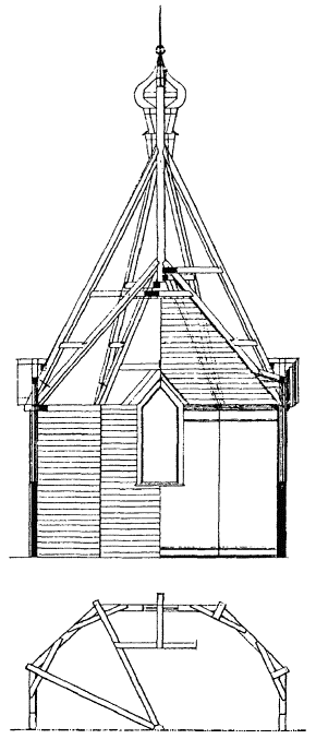 Рис. 53. Конструкция шатрового завершения (из альбома проектов храмов, 1911 г.) Металлические кресты выполняются из профиля, выгнутого из металлического листа толщиной 2,5 мм или из полосы толщиной около 5 мм. Швы со снятыми фасками тщательно провариваются электродами Э-42А и зачищаются заподлицо с поверхностью. Крест очищается от ржавчины, покрывается свинцовым суриком на натуральной олифе за 2 раза и обтягивается тонкими листами меди с пропайкой швов. В дальнейшем медные листы могут быть покрыты позолотой.