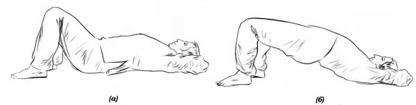 Рис.58 Упражнение «Подъёмы таза»: а) исходное положение; б) конечное положение.