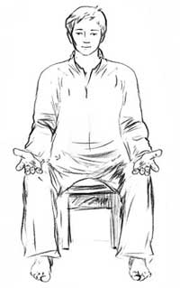 Медитация-присутствие Медитация-присутствие – наиболее важный метод для энергетического развития, для наполнения жизненной силой, возвращения ранее утраченных активности, физической и умственной работоспособности, эмоциональной яркости и наполненности сексуальной энергией. Медитация-присутствие всегда выполняется при открытых глазах. Это условие является очень важным и нарушать его нельзя. Стоит только закрыть глаза, как осознание окружающего мира сразу же резко ослабляется, зато столь же резко усиливается осознание мира внутреннего. Таким образом, та же самая техника осознания при открытых глазах даёт медитацию-присутствие, а при закрытых – медитацию-самонаблюдение. Об этом я уже многократно говорил, однако, поскольку это правило имеет очень большое практическое значение, считаю необходимым повторить его ещё раз. В моей школе используются два варианта медитации-присутствия, весьма сильно различающиеся по своему воздействию. В первом варианте медитация-присутствие выполняется в сидячей позе всадника, во втором – в положении стоя (метод столбового стояния). Рассмотрим каждый из этих методов по-отдельности. Этот метод энергомедитативной практики является уникальным и незаменимым. Он оказывает сильное и весьма благотворное воздействие на всю энергосистему практикующего. Сидячая поза всадника обратного круга – это удобная, безопасная и, в то же самое время, невероятно эффективная медитативная позиция тела. Поэтому я особенно рекомендую её для постоянной практики, как один из наиболее ценных методов. Эта медитативная позиция имеет исключительно важное значение, особенно если вашей основной практикой является столбовое стояние. Большие объёмы стояния столбом (по 30-60 минут) сильно загружают ноги и даже могут привести к серьёзным осложнениям, таким как варикозное расширение вен, отечность ног, боль и чувство тяжести в ногах. Поэтому тот, кто много стоит столбом, обязательно должен также практиковать медитацию-присутствие в сидячей позе всадника. Эта позиция – наилучшая для освобождения ножных энергетических каналов и ликвидации синдрома «забитых ног». Кроме того, это наилучшая поза для людей, страдающих отечностью ног, болями в ногах и варикозным расширением вен. Для женщин в период месячных медитацией следует заниматься только в этой позе, все остальные позиции тела в этот период не подходят. Сидячая поза всадника показана на рис.144. В отличие от классических медитативных поз (Падмасаны и Сиддхасаны), здесь ноги не скрещиваются. Это принципиально важный момент. Именно благодаря тому, что ноги не скрещиваются, а подошвы стоят на полу, обеспечивается полноценная циркуляция энергии по ножным энергетическим каналам, как ножным янским (выход энергии), так и по ножным иньским (вход энергии). Сидячую позу всадника можно также называть позой открытых ног или же позой фараона. Это положение сидя на стуле с широко расставленными ногами. Высота стула должна быть подобрана таким образом, чтобы колени находились примерно на том же уровне, что и тазобедренные суставы. При необходимости можно поднять ноги, подложив под них свернутое вчетверо одеяло. В сидячей позе всадника для обратного круга подошвы стоят на полу, а ноги расставлены на расстояние несколько большее, чем ширина ваших плеч. Ступни ног поставлены параллельн
