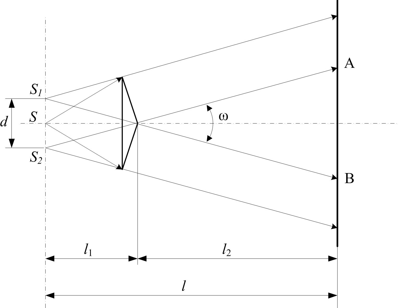 Расстояние d между мнимыми источниками может быть косвенным образом измерено с помощью собирающей линзы, установленной перед экраном так, чтобы на нем получилось действительное изображение источников S 1 и S 2 (рис. 3). В этом случае по формуле увеличения линзы d = где d ¢ – расстояние на экране между изображениями источников S 1 и S 2, a и b – расстояния от источников до линзы и от линзы до экрана соответственно. Так как преломляющий угол бипризмы мал (порядка долей градуса), мнимые источники S 1 и S 2 расположены в одной плоскости с источником S, то все лучи при преломлении отклоняются на одинаковый угол w/2. Величина w называется угловой шириной зоны интерференции. Экспериментально угол w может быть определён путем измерения протяженности поля интерференции (на рис. 1 это область АВ) и расстояния l 2 между бипризмой и экраном, а также расстояния d между мнимыми источниками и расстояния l 1 от источников до бипризмы: w = 2 arctg w = 2 arctg Формулы легко получаются из геометрических соображений (смотри рис. 1). Исходя из подобия треугольников (для малых углов) можно записать следующее: