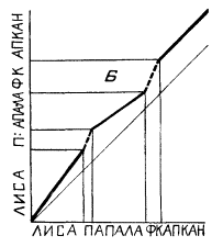 Рис. 3. Моменты реализации различных артикулятерных событий во фразе, произнесенной испытуемым (по вертикали), в зависимости от времени их реализации во фразе, произнесенной диктором (по горизонтали). А - случай, когда запинка не изменяет темп речи, Б - случай, когда темп остается стабильным только в интервалах между запинками артикуляций с темпом выбора информации из памяти. При такой интерпретации наблюдаемых эффектов, заикание становится в каком-то смысле центральным нарушением. Однако в системе традиционных представлений о процессе речи такая трактовка не согласуется с тем фактом, что запинки в речи заикающихся зависят от фонетических свойств звуков, т.е. от характера моторной их реализации. В нашей модели это противоречие устраняется, поскольку в ней информация о моторных компонентах речи содержится на достаточно высоких уровнях. Предыдущее изложение должно было показать, что предложенная модель позволяет понять многие закономерности нормальной речи и многие эффекты, характерные для речевых нарушений. Перечислим теперь вопросы, которые можно считать наиболее важными в ходе дальнейших исследований. При изучении процессов речеобразования центральной проблемой следует считать закономерности взаимной координации двигательных актов (закономерности коартикуляций). В настоящее время эта проблема исследуется только отдельными коллективами. Однако по своей направленности эти исследования в целом соответствуют тому подходу, который был намечен нами в ряде предыдущих работ. В частности, отдельные исследователи рассматривают активности артикуляторов как сопряженные по фазе и стремятся найти формальное выражение этой идее [Abbs, Gracoo, 1983; Graoco, Abbs, 1986].