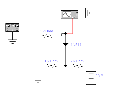 Рис.8 Схема диодного ограничителя. Схема диодного ограничителя состоит из нагрузки и диода 1N914. Напряжение подаётся от делителя напряжения. В исходном состоянии диод закрыт. Когда на вход подается сигнал положительной полярности, он передается на выход ограничителя до тех пор, пока не достигнет значения Uогр= 5,6 В (Uогр=5В+0,6В=5,6В), после чего диод открывается и пропускание сигнала на выход ограничителя прекращается вследствие шунтирующего действия открытого диода. Таким образом, рассматриваемый ограничитель пропускает без ограничения только те сигналы, которые меньше напряжения Uогр. Когда диод открыт, выходное напряжение совпадает с напряжением, снимаемым с делителя, при этом нижнее плечо делителя представлено эквивалентным сопротивлением. Для синусоидального входного напряжения выходное напряжение будет иметь вид представленный на Рис.10.