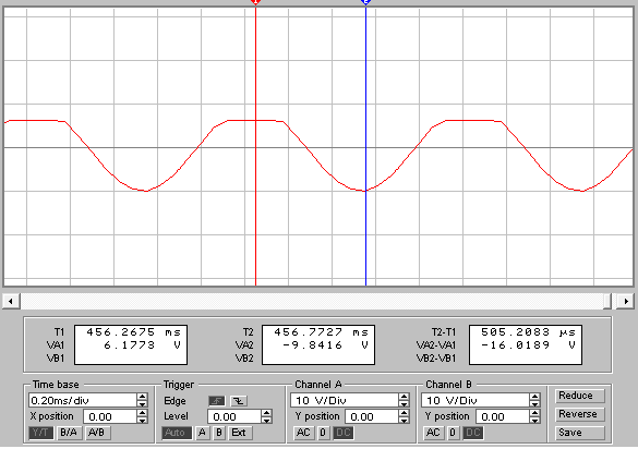 Рис.10. Показания осциллографа(входной сигнал -черный, выходной – красный).. Из рисунка 10 видно, что выходной сигнал скруглён в верху графика, а в нижней части графика сигнал остался без изменений, значит диодный ограничитель при таком способе подключения диода ограничивает только положительный сигнал. Возбудим схему треугольными импульсами и получим выходной сигнал, представленный на рисунке 11. Из рисунка видим, что треугольный сигнал также скруглен в верху, это значит что ограничитель работает не зависимо от формы сигнала. Добавим в схему конденсатор ёмкостью 15 мкФ(рис.12). Получим выходной сигнал ограниченный сверху, причем верхняя часть графика будет иметь вид линии, параллельной горизонтальной оси. Конденсатор используется в качестве шунта и при параллельном соединении конденсатора и резистора в 1Ком общее сопротивление будет меньше чем 1Ком. Диодные ограничители используют во всех семействах цифровых логических КМОП-схем. Они предохраняют эти чувствительные схемы от разрушения под действием разрядов статистического электричества. Рис.11. Показания осциллографа