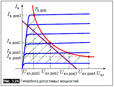 Эта кривая делит всю площадь первого квадранта семейства выходных характеристик на рабочую и нерабочую области. Если теперь совместить эту кривую с выходными характеристиками транзистора, то очевидно, что линия нагрузки не должна выходить за пределы рабочей области, чтобы не вывести транзистор из строя. На рис. 3.24 заштрихована рабочая область семейства выходных характеристик транзистора для схемы с общим эмиттером.