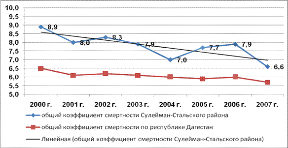 Общий коэффициент смертности (ОКС) в 2007 г. составил 6,6 промилле и был выше среднего по Республике Дагестан (5,7 промилле) на 0,9 промилле. В период 2000-2007 гг. динамика ОКС характеризовалась общим трендом уменьшения показателей. В период 2000-2007 гг. значение ОКС уменьшилось на 2,3 промилле. Минимальное значение общего коэффициента смертности было отмечено в 2007 г. - 6,6 промилле, максимальное в 2000 г. – 8,9 промилле – см. рис. 2. Рисунок 2. Динамика и линейный тренд движения общего коэффициента смертности Сулейман-Стальского района