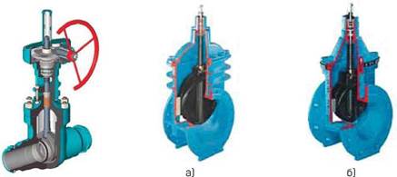 Технические характеристики, конструкции задвижек Задвижка – это запорное устройство, в котором проход перекрывается поступательным движением затвора перпендикулярно движению потока транспортируемой среды. Задвижки широко применяют для перекрытия потоков газообразных и жидких сред в трубопроводах с диаметрами условных проходов от 50 до 2 000 мм при рабочих давлениях 0,4–20 МПа и температуре среды до 450 °С. Ниже представлены различные виды задвижек (рис. 24, 25). На нефтепроводах обычно применяют стальные клиновые задвижки с ручным или электрическим приводом. В сравнении с другими видами запорной арматуры задвижки имеют следующие преимущества: незначительное гидравлическое сопротивление при полностью открытом проходе; отсутствие поворотов потока рабочей среды; возможность применения для перекрытия потоков среды большой вязкости; простота обслуживания; относительно небольшая строительная длина; возможность подачи среды в любом направлении.