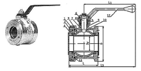 Рис. 41. Кран шаровый запорный компактный из нержавеющей стали: 1 – корпус; 2 – фланец запорный; 3 – пробка шаровая; 4 – седло; 5 – гайка нажимная; 6 – шпиндель; 7, 8 – кольцо; 9, 10, 11 – кольцо уплотнительное; 12 – ручка