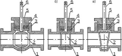 Рис. 43. Схемы кранов: а) – шаровый; б) – цилиндрический; в) – конический; 1 – корпус; 2 – пробка; 3 – разделительная шайба; 4 – сальниковая набивка; 5 – сальниковая втулка; 6 – хвостовик Краны классифицируют также и по другим конструктивным признакам, например: по способу создания удельного давления на уплотнительных поверхностях, по форме окна прохода пробки, по числу проходов, по наличию или отсутствию сужения прохода, по типу управления и привода, по материалу уплотнительных поверхностей и т.д. Преимущества кранов: – низкое гидравлическое сопротивление; – прямоточность; – простота конструкции; – небольшие габаритные размеры и масса; – высокая прочность и жесткость; – надежная герметизация; – независимость от направления движения среды; – возможность регулирования давления и подачи. Недостатки кранов: – максимальная рабочая температура 125 °С; – необходимость точности изготовления трущихся деталей; – высокая величина требуемого крутящего момента на шпинделе при открытии, закрытии. Для правильного выбора крана, обеспечения его работоспособности, надежности и долговечности необходимо знать условия, в которых будет работать данная конструкция, и требования, которые предъявляются к данному запорному устройству. Магистральные трубопроводы, как правило, состоят из труб большого диаметра (700 мм и более) и оборудованы преимущественно шаровыми кранами, которые принято считать более прогрессивным видом запорной арматуры. Для снижения усилия открывания при больших рабочих давлениях по обе стороны.