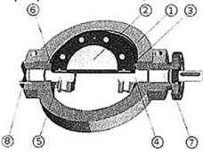 Рис. 48. Запорный клапан с одинарным эксцентриситетом: 1 – корпус; 2 – тарель; 3 – седло; 4, 5 – вал, цапфа; 6, 7, 8 – уплотнение Дисковые поворотные затворы позволяют соединить в одной конструкции две основные функции трубопроводной арматуры – регулирование и полное перекрывание (запирание) потока, что обуславливает экономичность их использования. Отличие дисковых затворов от подобных им по конструкции дроссельных заслонок состоит в том, что затворы обеспечивают герметичность в закрытом положении. На рисунке 46 представлен затвор поворотный дисковый в разъемном корпусе. Основные преимущества дисковых затворов по сравнению с другими видами запорной арматуры – простота конструкции, малые габаритные размеры и масса – дают тем больший эффект, чем больше условный проход арматуры. Дисковые затворы можно классифицировать по следующим признакам: – по конструкции и расположению уплотнений различают затворы с металлическим уплотнением, с эластичными уплотнениями на диске и в корпусе. Последние, в свою очередь, могут быть с эластичным уплотнительным кольцом, эластичным седлом и эластичной рубашкой на корпусе. Ниже показан дисковый затвор с уплотнением на диске; – по расположению вала и диска затворы могут быть с соосным расположением вала и диска, с наклонным диском и наклонным валом; – по типу присоединения к трубопроводу затворы разделяют на фланцевые и бесфланцевые. Привод дисковых затворов бывает ручной, с механическим редуктором, пневматический, гидравлический и электрический. Так же различают запорные клапаны с одинарным и двойным