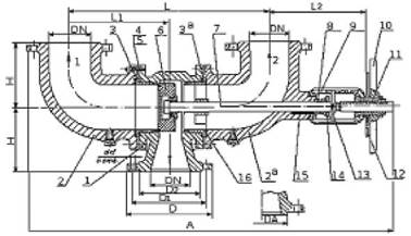 Рис. 65. Переключающее устройство предохранительного клапана: 1 – корпус; 2, 2а – угольник; 3, 3а – седло с наплавкой; 4 – шпилька; 5 – гайка; 6 – золотник с наплавкой; 7 – шпиндель; 8 – втулка; 9 – стойка; 10 – маховик; 11 – втулка; 12 – звездочка; 13 – обойма; 14 – фланец; 15 – набивка сальника; 16 – прокладка В переключающем устройстве при вращении маховика происходит перемещение запорного органа с одного седла к другому, тем самым с защищаемым объектом будут соединены или один предохранительный клапан, или оба. Ползун, установленный на шпинделе, указывает расположение запорного органа. При установке блока, состоящего из переключающего устройства и предохранительных клапанов, необходимо предусмотреть дополнительное крепление системы, обеспечивающее жесткость и прочность конструкции.