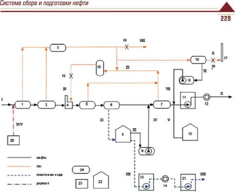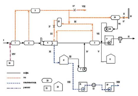 Рис. 5. Схема предварительной подготовки нефти на комплексе сооружений ДНС – УПСВ – КНС: 1 – предварительный сепаратор; 2 – сепаратор первой ступени; 3 – газосепаратор; 4 – трехфазный сепаратор «Хитер-Тритер»; 5 – сепаратор-буфер; 6 – ОРВС; 7 – емкость сбора нефти с насосом; 8 – АРВС; 9 – нефтенасосная; 10 – УУН; 11 – станция насосная откачки стоков; 12 – УУВ; 13 – сепаратор центробежный вертикальный; 14 – сепаратор факельный; 15 – факел аварийного сжигания газа; 16 – емкость сбора конденсата; 17 – УУГ; 18 – БДР; 19 – КНС; 20 – резервуар противопожарного запаса воды; 21 – противопожарная насосная; 22 – емкость хранения пенообразователя; I – продукция с кустов скважин; II – нефть на ЦПС; III – нефть в емкость сбора нефти; IV – нефть в сепараторы-буферы; V – нефть в (из) АРВС; VI – газовый конденсат в емкость сбора конденсата; VII – конденсат на вход насосов перекачки нефти; VIII – газ на ГТЭС, ГПЭС, КС; IX – газ на собственные нужды; X – газ на факел; XI – подтоварная вода в ОРВС; XII – подтоварная вода на вход насосов откачки стоков; XIII – подтоварная вода на кусты скважин; XIV – реагент-деэмульгатор во входной трубопровод на ДНС