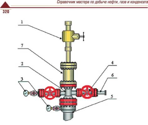 Рис. 8. Схема обвязки устья скважины при проведении гидравлического разрыва пласта (с установленной катушкой промывочной КП-4): 1 – устьевая запорная арматура ГРП; 2 – крестовина фонтанной арматуры; 3 – манометр с краном высокого давления; 4 – задвижка фонтанной арматуры; 5 – колонная головка (ОУС, ОКК, ОКО и т.д.); 6 – быстроразъемное соединение; 7 – катушка промывочная КП-4 Непосредственно операция по ГРП включает в себя: • проведение «мини-фрака» (при необходимости) и корректировка на его основе расчета ГРП; • последовательную закачку оторочек композиций химреагентов и технологической жидкости в объемах и на режимах, предусмотренных расчетом ГРП; • закачку технологической жидкости – песконосителя – с постепенным увеличением концентрации проппанта в соответствии с утвержденным расчетом проведения разрыва; • нагнетание оторочки продавочной жидкостью в объеме, обеспечивающем закачку геля с проппантом в пласт. После проведения ГРП по окончании закачки продавочной жидкости скважина оставляется на время, необходимое для распада геля. Заключительные работы после проведения ГРП: • отстой скважины в течение 24 часов для распада геля; • отработка скважины; во избежание выноса проппанта отработка ведется через штуцер с дебитом не выше 0,5 м3/ч (12 м3/сут);