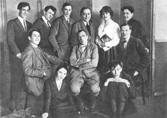 В. Э. Мейерхольд с первым выпуском Гэктемаса. 1926 г. Стоят: П. И. Егоров, И. Я. Савельев, А. В. Кельберер, В. Ф. Федоров, 3. Н. Райх, С, В. Козиков; сидят: Н. В. Сибиряк, В. Э. Мейерхольд, Н. Л. Охлопков; на полу: Е. Б. Бенгис. Э. П. Гарин