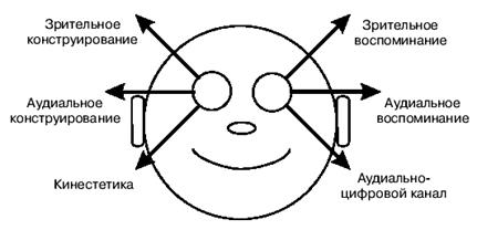 Наблюдение Джеймса о том, что мышление в визуальных терминах сопровождается вращением глазных яблок, описывает классический ключ доступа в модели внутренней визуализации НЛП. Ключи доступа — это такие моменты поведения, которые сопровождают активизацию некоторой репрезентативной системы. НЛП определяет ряд типов поведенческих микроключей; сюда входят движения глазных яблок и другие физические черты, связанные с процессами в сознании, в особенности, с тем, где задействованы наши пять органов чувств. Определение Джеймса указывает, что ключи доступа являются “минимальными рефлексами, набор которых мал и которые беспрестанно повторяются среди больших флуктуаций в остальном содержимом мозга и являются совершенно не важными и абсолютно не интересными, за исключением их использования в стимулировании или торможении присутствия разных вещей и действий, предшествующих осознанию”. Движения глаз, например, представляют собой одно из самых интересных “минимальных рефлексов” микроповеденческих ключей, наиболее тесно связанных с НЛП. Часто говорится, что глаза — зеркало души. В НЛП глаза считаются окном в мозг. Движение глаз вверх, влево или вправо обычно сопровождает зрительные представления (визуализацию). Движение глаз влево наверх обычно совпадает с воспоминанием визуальных впечатлений, тогда как движение вправо наверх сопровождает формирование конструируемых образов или фантазий. Горизонтальное движение глаз обычно сопровождает процесс слушания. Чувства сопровождаются направлением глаз вниз. Обычно направление глаз влево указывает на воспоминание, тогда как движение глаз вправо сопровождает работу воображения. Эти ключи суммируются на следующей диаграмме.