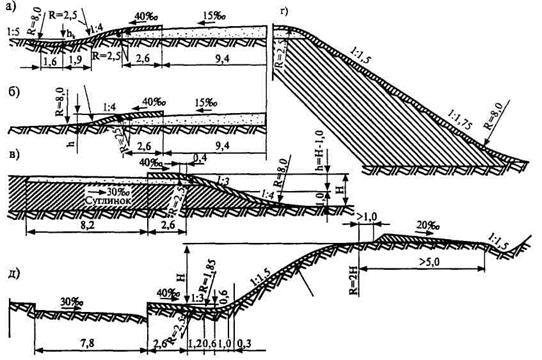 Рис 9.14. Обтекаемые поперечные профили земляного полотна, принятые в России: Пологие обтекаемые откосы имеют следующие преимущества по сравнению с обычно применяемыми откосами постоянной крутизны: обеспечивают безопасность движения, поскольку при отсутствии боковых канав автомобиль, потерявший управление, имеет возможность съехать по пологому откосу с насыпи на прилегающую полосу отвода; возрастает уверенность водителя в управлении автомобилем, так как он видит весь откос, а не только бровку земляного полотна, закрывающую от него вид на откос насыпи; обеспечивается лучшее обтекание земляного полотна снеговетровым потоком и снег переносится через дорогу, не откладываясь на проезжей части. При индивидуальном проектировании земляного полотна, например, в парковых зонах, мелкие выемки и невысокие насыпи обязательно устраивают с пологими откосами. Коэффициент заложения откосов принимают тем большим, чем ниже насыпь. У мелких насыпей откосам придают заложение 1:4 - 1:6. Высокие насыпи устраивают или с постоянным по высоте заложением откосов, или даже делают откосы ломаными с крутизной уменьшающейся по мере приближения к подошве. Откосы выемок чаще всего устраивают с откосами постоянной крутизны. Большое внимание уделяют сопряжению земляного полотна с прилегающими формами рельефа, добиваясь их плавного слияния. Для этого верхнюю часть откосов выемок и подошву насыпей плавно сопрягают с прилегающей поверхностью грунта по круговым кривым малого радиуса, обычно принимаемого равным одной-двум величинам рабочих отметок. При сильно пересеченном рельефе местности для лучшего вписывания дороги в ландшафт крутизну откосов выемок и насыпей следует изменять как по высоте, так и по протяжению дороги в зависимости от значения рабочих отметок. Для наилучшего сочетания форм земляного полотна с ландшафтом необходимо: устраивать более пологие откосы, чем меньше рабочие отметки насыпей и выемок. Наиболее просто достигнуть этого можно, приняв постоянный размер подошвы откоса, соответствующий крутизне откоса 1:1,5 в месте наибольшей глубины выемки; наряду с округлением кромок земляного полотна использовать плавные формы перехода элементов земляного полотна в окружающие элементы рельефа, например, заполняя пазухи с верховых сторон насыпей на косогорах или срезая бугры, образующиеся в выемках на косогорах у низовых сторон откосов; на участках перехода из выемок в насыпи устраивать очень пологие откосы с заложением от 1:7 до 1:12, что способствует уменьшению заносимости дороги снегом; в местах, где дорога пересекается путепроводами, прилегающим участкам земляного полотна придавать геометрически правильные очертания, плавно переходящие через 20-40 м в обтекаемые поперечные профили; при длинных затяжных выемках примерно постоянной глубины, которые приходится устраивать с откосами постоянного заложения, для расчленения однообразного вида откосов использовать посадку декоративных групп деревьев и кустарников; избыточный грунт, получаемый при разработке выемок, в первую очередь, использовать для засыпки пониженных мест рельефа с одновременной рекультивацией для передачи сельскому хозяйству, а при невозможности этого - отсыпать вблизи дороги отвалы, оформляемые на основе проектов, разработанных ландшафтным архитектором; применя