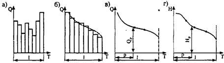Примечания: * В районах с неразвитой сетью автомобильных дорог для сооружений, имеющих особо важное народнохозяйственное значение, при технико-экономическом обосновании вероятность превышения допускается принимать 0,33 вместо 1 % и 1 вместо 2 %. ** В районах с развитой сетью автомобильных дорог для автодорожных малых мостов и труб при технико-экономическом обосновании вероятность превышения допускается принимать 2 вместо 1 %, 3 вместо 2 % и 5 вместо 3 %. Например, чем выше категория автомобильной дороги, на которой проектируют мостовой переход, тем меньшей вероятности паводок принимают в качестве расчетного. Железнодорожные мостовые переходы, где практически невозможно организовать объезд в случае их разрушения и народнохозяйственные потери, связанные с вынужденными перерывами движения, оказываются огромными, проектируют, используя более жесткие нормы и требования, чем для автомобильных дорог, где такой объезд организовать можно. Некоторые крупнейшие гидротехнические сооружения гидроэнергетики и водоснабжения проектируют на паводки, которые вообще не могут быть превзойдены более высокими, т.е. имеющими вероятность превышения 0 % (паводки «максимум-максиморум»). Практическая повторяемость таких паводков составляет 1 раз в 10 000 лет при сроке изменения климата на земном шаре в 12 000 лет, равном периоду качания земной оси. Однако стоимость сооружений, запроектированных на физически возможный предельный паводок, чрезвычайно велика, поэтому оказывается экономически целесообразным ограничивать величины расчетных паводков, хотя и весьма редкими, но реально превышаемыми в течение расчетного срока службы паводками, т.е. проектировать мостовые переходы с экономически оправданной степенью инженерного риска. Ряды максимальных годовых расходов и уровней воды на реках, зафиксированных в течение ряда лет непрерывных наблюдений на водомерных постах Гидрометеослужбы, могут быть изображены в виде столбчатой диаграммы: хронологической (рис 16.1, а), либо ранжированной в убывающем порядке (рис. 16.1, б). Средняя высота ряда и характерное вогнуто-выпуклое очертание не изменяются с увеличением длительности наблюдений на водомерных постах реки. Чем больше длительность наблюдений, тем более плавное очертание приобретает ранжированная диаграмма. При гипотетически бесконечной длительности ряда непрерывных наблюдений и неизменной длине диаграммы последняя принимает плавное криволинейное очертание для максимальных годовых расходов (рис. 16.1, в) и максимальных годовых уровней воды (рис. 16.1, г).