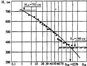 Рис. 16.2. Кривые на клетчатке вероятностей: Однако, в отличие от логарифмической клетчатки, ось ординат клетчатки вероятностей принимают равномерной, а неравномерную функциональную шкалу абсцисс строят по уравнению нормального распределения Пирсон III при коэффициенте асимметрии Cs = 0. Получаемые на клетчатке вероятностей плавные кривые, имеющие выпуклость вверх для максимальных уровней воды (Cs < 0) или выпуклость вниз для максимальных расходов (Cs > 0), а также практические прямые вероятностей расходов и уровней при Cs» 0 позволяют выполнить довольно точную экстраполяцию в область малых вероятностей превышения. При графической экстраполяции не задаются типом уравнения кривой вероятности, поэтому ошибки, связанные с обязательным использованием уравнения кривой распределения определенного типа, на результаты расчета не влияют. Чем круче наклон кривых вероятностей, тем большим коэффициентом вариации Cv (изменчивостью) характеризуется ряд, тем опаснее река для жизни мостового перехода. После определения расхода воды расчетной вероятности превышения Qр% изложенным выше аналитическим или графо-аналитическим методом переходят к определению расчетного уровня высокой воды той же вероятности превышения РУВВр%. Такой расчет может быть легко выполнен при наличии в створе перехода гидрометрической кривой расходов Н = f (Q), построенной по данным непосредственных гидрометрических измерений. На существующей сети водомерных постов России в большинстве случаев водомерные наблюдения систематически проводятся только за уровнями воды в реках. Поэтому, определение расчетных уровней воды, совершенно необходимых для разработки проектов мостовых переходов, как правило, выполняют самостоятельно. Непосредственное использование теоретического метода с применением уравнения вероятности Пирсон III, изложенного выше для максимальных расходов, для вероятностной обработки уровней воды недопустимо. В этих случаях необходимо учитывать совпадение вероятностей превышения величин максимальных расходов и уровней и производить самостоятельную обработку рядов максимальных уровней специальным, изложенным ниже, статистическим методом. Графо-аналитический расчет максимальных уровней воды расчетной вероятности превышения осуществляют в следующей последовательности (рис. 16.3): 1. Ряд максимальных наблюденных уровней воды в реке ранжируют в убывающем порядке. 2. Каждому члену ранжированного ряда присваивают соответствующие эмпирические вероятности превышения, определяемые по формуле (16.1). 3. По полученным парам значений Нi и Pэ%i наносят точки на клетчатку вероятностей. 4. Осуществляют графическую аппроксимацию полученного поля точек плавной кривой, которую экстраполируют в область малых вероятностей превышения.