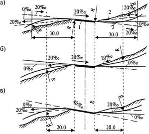 Рис. 18.2. Принципиальные решения проектной линии продольного профиля второстепенной дороги на ее пересечении с главной дорогой: а - второстепенная дорога сопрягается вертикальной кривой с проезжей частью главной дороги: продольный уклон дороги примыкания равен вместе сопряжения поперечному уклону главной дороги, в некоторых случаях возможен большой объем земляных работ; б - второстепенная дорога сопрягается прямолинейным участком с проезжей частью главной дороги: продольный уклон участка дороги примыкания направлен в сторону, противоположную поперечному уклону главной дороги, решение способствует снижению объемов земляных работ; в - второстепенная дорога сопрягается вертикальной кривой с проезжей частью главной дороги, профильный уклон дороги примыкания равен нулю, решение способствует снижению объемов земляных работ; Пересечение считают удобным для движения при условии, если при совершении поворотных маневров большегрузными автомобилями и автопоездами не возникает затруднений. Для этих целей минимальные радиусы закруглений следует назначать не менее 30 м. Для исключения неправильных действий водителей в пределах пересечения оно должно быть предельно понятным водителю. Расстановку дорожных знаков и указателей на пересечениях производят в соответствии с действующими ГОСТами и правилами.