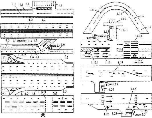 Рис. 20.10. Виды горизонтальной разметки Отдельные виды горизонтальной разметки имеют следующее назначение (рис. 20.10): 1.1 применяют в следующих случаях: для разделения потоков транспортных средств, движущихся в противоположных направлениях (осевая линия) на дорогах, имеющих две или три полосы для движения в обоих направлениях: на участках дорог, где зоны с видимостью встречного автомобиля менее допустимой перекрывают друг друга; на всем протяжении кривых в плане, радиусы которых не превышает 50 м, а также на примыкающих к ним участках переменной кривизны; перед перекрестками при интенсивности движения по пересекающей дороге не менее 50 авт./сут; перед железнодорожными переездами - на протяжении 100 м от ближнего рельса; на участках дорог, где не обеспечено расстояние видимости встречного автомобиля; перед препятствием (опора путепровода, островок безопасности, бортовой камень, бордюр и т.д.); перед пешеходными переходами, пересечениями с велосипедными дорожками; на участках дорог с тремя полосами движения в обоих направлениях; на участках дорог с полосой для маршрутных транспортных средств, движущихся навстречу общему потоку транспортных средств. 1.2 применяют для обозначения границ полос движения на дорогах с двумя и более полосами при движении в одном направлении: перед перекрестками, пешеходными переходами и железнодорожными переездами; на участках дорог с полосой для маршрутных транспортных средств, движущихся попутно общему потоку транспортных средств; для обозначения границ участков проезжей части, на которые въезд запрещен (островки безопасности, направляющие островки и т.д.); для обозначения границ стояночных мест на площадках, предназначенных для стоянки транспортных средств или на стоянках около тротуаров. Минимальные размеры одного стояночного места при последовательном размещении автомобилей вдоль края проезжей части или края стояночной площадки должны быть не менее 2,5´7,5 м для легковых и 3,0´11,0 м - для грузовых автомобилей без прицепов. При параллельном размещении автомобилей относительно друг друга - соответственно 2,5´5,0 м и 3,5´8,5 м. 1.2.1 и 1.2.2 применяют для обозначения края проезжей части (краевая линия). 1.3 применяют для разделения транспортных потоков противоположных направлений (осевая линия) на дорогах, имеющих четыре и более полос движения в обоих направлениях с учетом переходно-скоростных и дополнительных полос (см. рис. 20.10). 1.4 применяют на участках дорог, где запрещена остановка транспортных средств. Разметку наносят на расстоянии 0,1-0,2 м от кромки проезжей части, при наличии краевой линии - вместо нее по верху бордюра. 1.5 применяют для: разделения транспортных потоков противоположных направлений (осевая линия) на дорогах, имеющих две или более полос движения в обоих направлениях; обозначения границ полос движения на дорогах, имеющих две или более полосы для одного направления. 1.6 (линия приближения) применяется для предупреждения о приближении к разметке 1.1 или 1.11, разделяющей потоки транспортных средств, движущихся в противоположных или попутных направлениях. 1.7 применяют для обозначения границ полос движения в пределах перекрестка в случаях, когда необходимо показать траекторию движения транспортных средств или обозначить границы полосы движения. 1.8 применяют для обозначения границы между полос