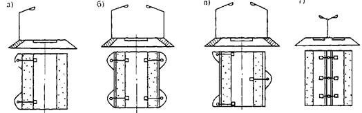 Рис. 20.23. Способы установки опор светильников на откосах высоких насыпей При проектировании осветительных установок учитывают светотехнические характеристики дорожных покрытий, мощность ламп, светораспределение светильников, схему размещения опор (рис. 20.24). Выбор параметров осветительной установки осуществляют на основе технико-экономических расчетов по дисконтированным затратам. Опоры размещают с одной стороны дороги (односторонняя схема), если ширина проезжей части не превышает 12 м (см. рис. 20.24, а). При большей её ширине опоры устанавливают с двух сторон дороги в прямоугольном (см. рис. 20.24, б) или шахматном порядке (см. рис. 20.24, в). Эти схемы используют и при проектировании осветительных установок на дорогах с разделительной полосой, но в отдельных случаях по экономическим соображениям допускается установка опор на разделительной полосе шириной не менее 5 м (см. рис. 20.24, г) при условии зашиты опор ограждения. В зависимости от нормируемых значений яркости и освещенности опоры располагают через 25-40 м, а светильники подвешивают на высоте 6-12 м. На закруглениях дорог в плане радиусом менее 600 м опоры устанавливают у обочины на внешней стороне кривой. При этом следует уменьшать расстояние между опорами на закруглении дороги по сравнению с расстоянием, принятым для прямолинейного участка (табл. 20.15).