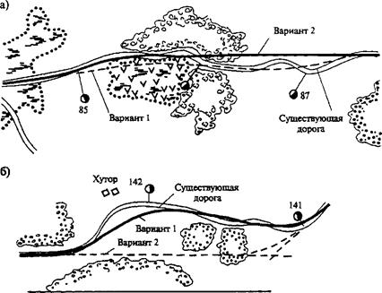 Рис. 21.5. Варианты исправления трассы дороги в плане: Аналогичным образом приходится существенно корректировать план и продольный профиль трассы на участках неудачного сочетания плана и продольного профиля автомобильных дорог, дезориентирующих водителей в части дальнейшего направления трассы за пределами фактической видимости, а также в случаях неудачного вписывания полотна дороги в прилегающий ландшафт (см. главу 9). На участках прохождения реконструируемых дорог по населенным пунктам, в связи с закономерным ростом интенсивности движения, год от года условия движения становятся все более напряженными: снижается скорость транспортных потоков, растет аварийность, растет негативное влияние транспортных потоков на экологию придорожной полосы и расположенные там жилые объекты и т.д. В связи с этим, на участках прохождения дорог по населенным пунктам всегда приходится рассматривать варианты их обхода реконструируемой дорогой, в подавляющем большинстве случаев в пользу строительства по новому направлению. На участках реконструируемых автомобильных дорог часто встречаются пересечения других автомобильных и железных дорог в одном уровне. На старых автомобильных дорогах нередко встречаются участки, где такие пересечения встречаются на близком расстоянии. Путем спрямления реконструируемой дороги удается сократить число таких пересечений, а целесообразность строительства пересечений в разных уровнях обосновывают путем технико-экономических сравнений вариантов. На участках существующих автомобильных дорог с неблагоприятными грунтовыми, геологическими и гидрогеологическими условиями, с необеспеченным поверхностным водоотводом (оползни, осыпи, пучинообразования, снегозаносы и т.д.) рассматривают варианты обхода этих участков, либо путем изменения проектной линии продольного профиля. При этом, все изменения проектной линии продольного профиля связаны с неизбежной перестройкой на значительном протяжении существующих покрытий с существенной потерей материалов, с необходимостью перестройки водопропускных труб, мостов и путепроводов.