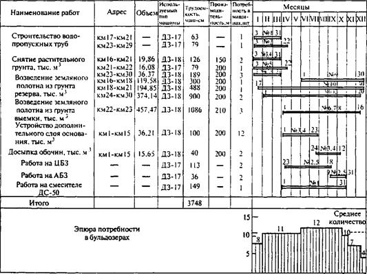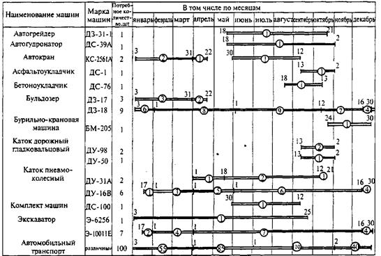 Одним из обязательных документов проекта автомобильной дороги является график потребности в основных строительных машинах и транспортных средствах. Потребность в основных строительных машинах и транспортных средствах планируют на основе предварительно разработанного календарного плана строительства автомобильной дороги и принятых решений по структуре машинного парка. При этом в результате составления этого графика могут быть выявлены ощутимые колебания числа необходимых для строительства дороги машин и транспортных средств, для выравнивания потребности и согласования ее с имеющимся парком машин должны быть приняты решения по оптимизации календарного плана и изменению порядка выполнения определяющих потребность в машинах и транспортных средствах работ. Далее путем последовательных приближений определяют оптимальную очередность, продолжительность выполнения отдельных процессов и экономическую целесообразность выбранной структуры парка машин. Графики потребности (рис. 22.7, 22.8 и 22.9) в основных строительных машинах и транспортных средствах строят в форме ленточной диаграммы, вдоль горизонтальной оси которой откладывают соответствующие интервалы времени (смены, дни, недели, месяцы).
