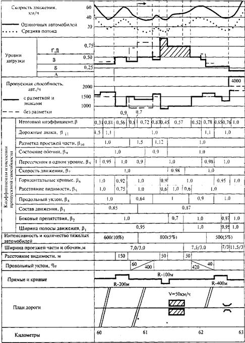 Примечания: 1 Максимальная пропускная способность второстепенной дороги на подходе к пересечению определяется по формуле (23.5). В таблице приведены пропускные способности направлений движения на пересечении при наличии дополнительных полос для поворачивающих потоков. 2 С отдельной полосы второстепенной дороги. 3 При доле левоповоротного движения с второстепенной дороги до 20 %. Вследствие изменения дорожных условий по длине дороги происходит также изменение пропускной способности дороги. Для ее характеристики целесообразно строить линейный график изменения пропускной способности дороги и коэффициента загрузки движением (рис. 23.1).