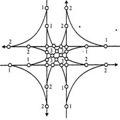 Рис. 24.5. Схема расположения конфликтных точек на пересечениях в одном уровне: По методике, предложенной проф. Е.М. Лобановым, можно определить опасность дорожно-транспортных происшествий в каждой конфликтной точке: Mi, Ni - интенсивности движения транспортных потоков, пересекающихся в данной конфликтной точке, авт./сут; Кi - коэффициент относительной (сравнительной) аварийности конфликтной точки; Кг - коэффициент годовой неравномерности движения, принимаемый для европейской части Российской Федерации по табл. 24.5. Для других регионов для определения его значения должны быть проведены экономические обоснования. Коэффициент 25 введен в формулу (24.1) для учета влияния среднего количества рабочих дней, в течение которых загрузка дорог резко превышает загрузку в нерабочие дни. Таблица 24.5. Коэффициент годовой неравномерности движения