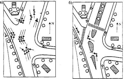 Рис. 24.6. Пример использования плана дорожно-транспортных происшествий для реконструкции перекрестка: а - перекресток до реконструкции; б - после реконструкции Нанося на план пересечения места дорожно-транспортных происшествий в масштабе 1:100 - 1:250 условными обозначениями пути следования столкнувшихся автомобилей (рис. 24.6), можно установить наиболее опасные конфликтные точки, выявить влияние дорожных условий, вызывающих систематические ошибки водителей. На план наносят все элементы ситуации, которые могут влиять на условия движения пешеходов и автомобилей (границы проезжей части, разграничительные линии на покрытии, опоры путепроводов, мачты уличного освещения и линии электропередачи, велосипедные и пешеходные дорожки, рекламные шиты и т.д.). Места сосредоточения дорожных происшествий характеризуют опасные точки пересечения, что позволяет установить ошибочные действия водителей, возможность повторения которых должна быть устранена устройством и выделением четких полос. При составлении плана дорожно-транспортных происшествий следует пользоваться установленной системой условных обозначений (рис. 24.7).