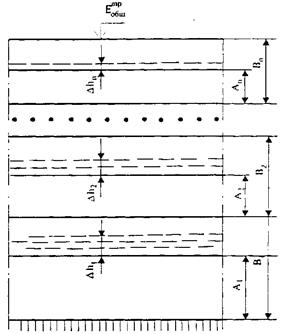mi - целое число. Если толщину какого-либо слоя варьировать нежелательно, то задают hi = Ai = Bi. Последовательность поиска оптимальной конструкции нежесткой дорожной одежды следующая: формируется первый вариант дорожной одежды таким образом, что толщины всех конструктивных слоев принимают равными ограничению снизу hi = Ai; выполняют все расчеты на прочность снизу вверх и осуществляют проверку исходной конструкции по всем техническим ограничениям. Если по какому-либо техническому условию конструкция не проходит, то увеличивают нижний (первый) слой на шаг перебора D h 1 (рис. 30.1) и вновь выполняют все расчеты; если в ходе расчета оказывается, что hi = Bi, а по каким-либо техническим ограничениям конструкция все еще не проходит, то увеличивают толщину второго слоя на шаг D h 2, а толщину первого слоя принимают h 1 = А 1 и вновь выполняют все расчеты, увеличивая первый слой с шагом h 1 = h 1 + D h 1 и т.д. до тех пор, пока не будет сформирован первый вариант, удовлетворяющий всем техническим условиям. Вариант запоминается и подсчитывается его стоимость; увеличивают толщину второго снизу слоя h 2 = h 2 + D h 2 и, полагая h 1 = А 1 вновь с шагом D h 1 отыскивают вариант, удовлетворяющий требованиям всех технических ограничений. Если стоимость сформированного таким образом второго варианта возросла, увеличивают толщину третьего слоя h 3 = h 3 + D h 3, принимая равными h 1 = А 1 и h 2 = А 2 и т.д. Вариант не запоминают. Если стоимость уменьшилась, вариант запоминают и, вновь увеличив слой h 2 = h 2 + D h 2 снова повторяют расчеты и т.д.