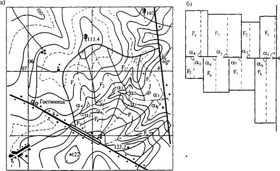 Рис. 31.1. Схематизация водосбора: Угол примыкания каждого бокового лога к главному принимают равным углу между направлением тальвега бокового лога и направлением потока в главном логу (см. рис. 31.1). Полученный на каждый j -й момент времени паводка сосредоточенный расход в устье каждого i -го бокового лога Qij представляют в виде равномерно распределенных погонных расходов на фактической ширине каждого бокового лога в устьевой его части: qij = Qij / Вyi, где Вyi - фактическая ширина i -го лога в устьевой его части. Таким образом, при описании неустановившегося течения ливневых вод по главному логу боковая приточность в каждый j -й момент времени может быть представлена в виде кусочно-постоянной функции (рис. 31.2).