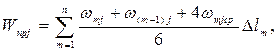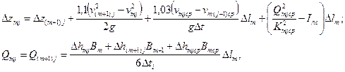 wmj, w ( m +l) j - площади живого сечения пруда в начальном и конечном сечениях расчетного участка длиной D lm при j -ом уровне времени, м2; wmjcp - площадь живого сечения в середине m -го участка, м2 Таким образом, основное расчетное уравнение в окончательном виде выглядит