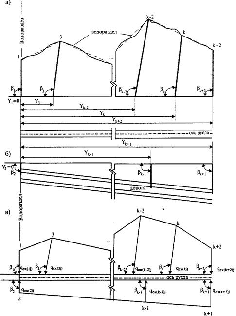 Рис. 31.14. Схема к расчету склонового стока: Во избежание сложности и трудоемкости расчета для отдельных i- х участков рассматриваемой k -й полосы склона ее схематизируют в виде односкатной поверхности со своими осредненными величинами уклона Ick(ki)cp и коэффициента шероховатости nckcp (см. рис. 31.14, в). С учетом сказанного система уравнений (31.1) в конечных разностях для k-й полосы склона представляется в виде:
