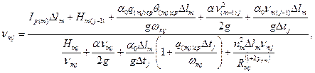 qck(knj) - погонный расход в n -м расчетном участке k -й полосы склона при j- м интервале времени, м 2 /с; qck(kn(j-1)) - то же при (j- 1)-м интервале времени; qck(k(n-1)j) - то же в (п -1)-м участке полосы при j- м интервале времени; D tj - расчетный j- й интервал времени, с; D xkn - расчетный n -й интервал длины k -й полосы, м;