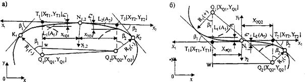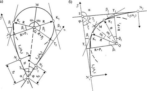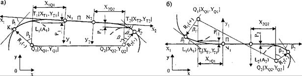 Рис. 33.11. Сопряжение круговой кривой с двумя прямыми посредством клотоид 4. Сопряжение двух круговых кривых клотоидами, переходящими в общую прямую. Комбинация элементов: КК1 - КЛ1 - П - КЛ2 - КК2 (рис. 33.12). В качестве исходной информации задают координаты центров круговых кривых Q 1[ XQ 1, YQ 1], Q 2[ XQ 2, YQ 2] и их радиусы со своими знаками R1 и R2, длины переходных кривых или их параметры L 1(A 1), L 2(A 2), или их отношение m = A 1/ A 2, а также сдвижки р 1 и р 2. В результате расчета устанавливают параметры уравнения сопрягающей прямой П.