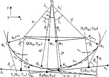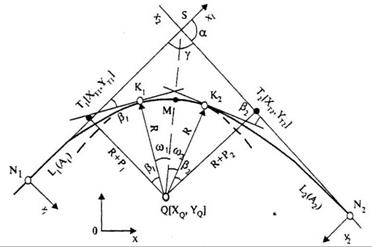 Рис. 33.13. Сопряжение двух круговых кривых третьей 6. Сопряжение двух круговых кривых двумя клотоидами. Комбинация элементов: КК1 - КЛ1 - КЛ2 - КК2 (рис. 33.14). В качестве исходной информации задают координаты центров круговых кривых в общей системе координат Q 1[ XQ 1, YQ 1], Q 2[ XQ 2, YQ 2] и их радиусы со своими знаками R1 и R2, отношение параметров m = A 1/ A 2. В результате расчета устанавливают положение локальной системы координат, параметры клотоид L 1(A 1), L 2(A 2), а также координаты главных точек (N1, N2, К1, К2, Т1, Т2).