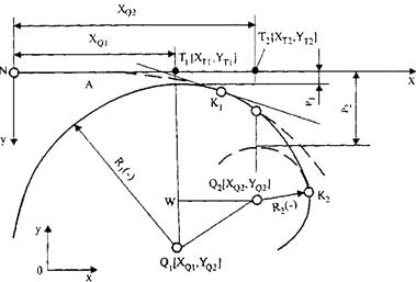 Рис. 33.9. Сопряжение двух круговых кривых прямой 2. Сопряжение круговой кривой с прямой посредством клотоиды. Комбинация элементов: КК - КЛ - П (рис. 33.10). В качестве исходных данных задают координаты центра круговой кривой в общей системе Q [ XQ, YQ ], радиус R и уравнение прямой координатами двух точек или координатами одной точки и углом наклона к оси абсцисс общей системы координат. В результате расчета устанавливают длину или параметр сопрягающей клотоиды L (A).