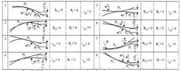 Рис. 33.18. Варианты сопряжения осей съезда и дороги в вертикальной плоскости Многодельность задачи установления положения проектной линии продольного профиля по соединительным рампам, многовариантный характер проработки конструктивных и плановых решений, необходимость перепроектирования продольного профиля одной из пересекающихся дорог или плана съезда при выявлении невозможности взаимоувязки между вертикальным решением и геометрией плана без нарушения требований технических нормативов делают весьма эффективным и даже необходимым применение компьютерной техники для решения задач данного класса. Для существенного ускорения расчетов и получения безошибочной и совершенной проектной линии продольного профиля по соединительным рампам в Союздорпроекте разработаны алгоритмы и программы, предназначенные для проектирования простых соединительных рамп выпуклого и вогнутого очертания при небольшой их длине и большом перепаде высот между начальной и конечной точками. Для расчета продольного профиля сложных соединительных рамп большой длины применяют известные программы проектирования продольного профиля автомобильных дорог. Основные особенности проектирования продольного профиля по соединительным рампам развязок движения, нашедшие отражение в соответствующих компьютерных программах, состоят в следующем: принят параболический вид вертикальных выпуклых и вогнутых кривых, получивших повсеместное распространение в отечественной и зарубежной практике; проектная линия построена из сопрягающихся между собой выпуклых и вогнутых вертикальных кривых, а также прямолинейных вставок между ними. Минимальные радиусы вертикальных кривых и допустимые продольные уклоны определяют в соответствии со строительными нормами и правилами. Вертикальные переходные кривые не используют вследствие больших радиусов вертикальных параболических кривых и малой их сдвижки; на участках переходных кривых в плане от точек расхождения осей съездов с осями внешних полос пересекающихся дорог до кромок расхождения их проезжих частей принят постоянный поперечный уклон дороги, обеспечивающий обязательное понижение проектной линии соединительных рамп в вертикальной плоскости для пересекающихся дорог соответственно на величины D h 1 и D h 1. Несмотря на противоестественное направление выпуклой кривой на нижнем конце съезда (рис. 33.19, схема 2), игнорирование этого условия влечет поднятие внешней кромки съезда и образование гребня на внешней полосе дороги с неоднократным изменением направления поперечного уклона, неблагоприятно сказывающимся на уровнях удобства и безопасности движения, а также затрудняющим водоотвод с проезжей части; в программах учтено многообразие продольных профилей пересекающихся дорог и условий сопряжения с ними съездов. Возможные случаи сопряжения вертикальных кривых радиусов R с элементами продольных профилей пересекающихся дорог представлены на рис. 33.18. Значительное количество возможных комбинаций сопряжения лишний раз свидетельствует в пользу необходимости использования вычислительной техники при проектировании проектной линии продольного профиля соединительных рамп транспортных развязок; обеспечена возможность получения множества решений и выбора наилучшего из них в случае, если условия 