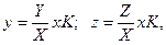 X, Y, Z - декартовы координаты точки А; х - расстояние от точки зрения до картинной плоскости по главному лучу; у, z - перспективные координаты той же точки на картинной плоскости; К - масштабный множитель.