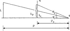 Рис. 34.3. Совмещенные изображения участка автомобильной дороги Минск-Брест, выполненные в центральной и перцептивной проекциях Степень несоответствия изображения автомобильной дороги в центральной проекции зрительному восприятию наблюдателя можно оценить при анализе изображения проектируемого участка автомобильной дороги Минск-Брест, полученные в проектном институте «Белремдорпроект» (рис. 34.3). Одно изображение получено в центральной проекции (тонкие линии), другое - в перцептивной (толстые линии). Как видно, объекты среднего и дальнего плана наблюдатель воспринимает на местности увеличенными и приподнятыми по сравнению с классической центральной проекцией или фотографией. Результаты анализа зрительной плавности и ясности автомобильных дорог по ведущим линиям с использованием центральной и перцептивной проекций существенно расходятся. Так, представленные на рис 34.3 изображения, дают значения видимого радиуса кривизны Ra и видимой ширины Вa в экстремальной точке соответственно для центральной и перцептивной проекций: Ra = 3, Вa = 2,06 и Ran = 67, Вan = 4,8. Математические формулы для расчета перцептивных проекций могут быть получены в соответствии с рис. 34.4. На расстоянии r от наблюдателя перпендикулярно главному лучу зрения расположен отрезок L, а на расстоянии rк перед наблюдателем - картинная плоскость N, тогда lc и lр будут соответственно величины центральной и перцептивной проекций отрезка L на картинную плоскость, а jс и jр - их угловые величины.