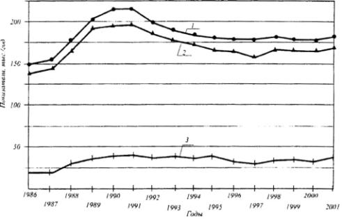 Отрицательное следствие автомобилизации - дорожно-транспортные происшествия, одной из причин которых является недостаточно высокое состояние автомобильных дорог. Ежегодно в мире на дорогах и улицах погибают около 500 тыс. человек, ранения различной степени тяжести получают до 15 млн. человек. Общий социально-экономический ущерб составляет до 3 % валового национального продукта. Согласно сведениям комиссии по транспорту ЕЭК ООН, ежегодно публикуемым в специальных справочниках, в первые годы XXI века в 55 странах с наиболее высокой автомобилизацией (Европейские страны, США, Канада, Израиль) в общей сложности регистрируется около 1 млн. ДТП с пострадавшими (половина - в США), в которых число погибших составляет порядка 150 тыс. человек, число раненых - 6 млн. человек. В период с 1986 по 2001 гг. в России ежегодно совершалось в среднем около 160 тыс. дорожно-транспортных происшествий, в которых погибало около 30 тыс. человек. Начиная с 1992 г. показатели аварийности ежегодно снижались, затем несколько стабилизировались, а с 2002 г. возросли в связи с существенным увеличением количества автотранспортных средств в стране (рис. 1.9), главным образом в крупных городах.