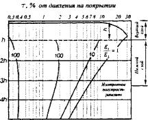 P - давление на покрытие, МПа; z - фактическое расстояние по вертикали от поверхности покрытия до рассматриваемой точки в земляном полотне, a zэ - расстояние до той же точки от поверхности дорожной одежды с эквивалентной толщиной hэ, см; r - расстояние по горизонтали до этой точки от оси действующей нагрузки, см; h - общая толщина одежды, см; hэ - толщина эквивалентной дорожной одежды, см. Сопоставления вертикальных напряжений, измеренных в грунтах, подстилающих различные конструкции одежд, с напряжениями, вычисленными по теоретическим формулам, приведены на рис. 5.3 и 5.4.