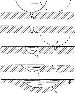 Рис. 5.13. Пример перехода трещин или раковин в выбоины: В любом случае выбоины и ямы необходимо заделывать на ранней стадии их образования. Опыт показывает, что каждая незаделанная выбоина увеличивается в размерах и способствует появлению новых выбоин. В начале этот процесс идет медленно, а затем приобретает лавинообразный характер. Если стоимость работ по ямочному ремонту, выполненному ранней весной, принять за единицу, то с опозданием ремонта на 2-3 месяца эта стоимость может возрасти в 3-5 раз.