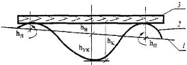 Рис. 5.15. Колея, образующаяся в результате вязкопластического размягчения вяжущего: Одновременно с вертикальными накапливаются и горизонтальные остаточные деформации, когда под действием сдвигающих напряжений происходит выдавливание частиц асфальтобетона в стороны. Эти деформации при многократных повторных приложениях нагрузки непрерывно возрастают, в результате чего по бокам колеи появляются гребни или валы. Накопление пластических деформаций в асфальтобетонном покрытии происходит летом при температуре воздуха выше 25-30°С, при которой температура покрытия повышается до 40-60°С и выше. Расчётной принимают температуру асфальтобетона 40-50°С и выше в зависимости от вязкости битума. Глубина пластической колеи зависит от исходной вязкости битума, состава асфальтобетона, числа приложений нагрузки и её величины, толщины слоя асфальтобетона. Структурное разрушение и остаточные деформации покрытия и слоев основания. Под действием многократно прилагаемых нагрузок в слоях дорожной одежды могут сложиться такие условия, когда вертикальные или горизонтальные напряжения превысят местные предельно допустимые значения напряжений и начнется разрушение сплошности или структуры материала слоя с потерей прочности и сдвигоустойчивости. Следствием этого является ускоренное накопление остаточных деформаций и формирование колеи, которая появляется после критического для данной конструкции дорожной одежды числа приложений тяжёлой нагрузки. Структурные разрушения покрытия происходят примерно одинаково в течение всего года, а в слоях основания они накапливаются больше всего весной, когда прочность дорожной одежды наименьшая. Глубина колеи за счет структурного разрушения зависит от прочности дорожной одежды, трещиностойкости, сдвигоустойчивости, срока службы покрытия, загруженности и т.д. Из общего количества случаев образования колеи структурные разрушения отмечаются в 25-35 % случаев. В программе HDM-4, где не учитывается роль земляного полотна, эта доля принята равной 50 %, т.е. это одна из наиболее важных причин образования колеи. Остаточные деформации в грунтах земляного полотна являются причиной образования колеи в 20-30 % случаев. Проблеме накопления остаточных деформаций в земляном полотне, в том числе и неравномерных остаточных деформаций посвящено много работ [7, 34, 71, 79, 94]. Установлен общий вид кривой накопления остаточных деформаций в земляном полотне в течение года, из которой следует, что наиболее активно оно происходит в весенний период. На кривой зависимости глубины и формы колеи от сопротивления грунта вдавливанию и сдвигу можно выделить фазу сжатия и уплотнения, фазу местных сдвигов и фазу выдавливания или выпучивания грунта в стороны. Имеются математические модели расчёта величины равномерных и неравномерных остаточных деформаций в земляном полотне. Однако они нуждаются в дальнейшем совершенствовании и, в частности, в учёте восстановления части накопившихся деформаций, которое может произойти летом и зимой. Таков общий характер образования колеи как сочетание всех возможных факторов. Основной характеристикой колеи является её глубина. Общая глубина колеи может быть определена исходя из схемы, приведённой на рис. 5.16: hк = hyк + hв, где (5.5) hyк - величина углубления на поверхности дорожной одежды за счёт накоплени