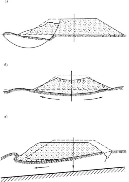 Рис. 6.2. Основные формы потери устойчивости насыпи на слабом основании Оползневой сдвиг (рис. 6.2, в) - это поперечное или продольное смешение всего объема насыпи и части основания по поверхности скольжения, определенный геологическими разностями в строении основания. Причиной оползневого сдвига насыпи почти всегда является недостаточный учет уклона кровли - плотных пластов, подстилающих болотную залежь. Сдвигу способствует малая проницаемость нижних пластов, так как в таком случае и, соответственно, сопротивление сдвигу в контактной зоне оказывается близким к нулю. Расползание насыпи (рис. 6.1, в; 6.1, г) происходит в результате использования при строительстве без специальных мероприятий переувлажнённых грунтов, несоблюдения требований по уплотнению грунтов, а также недоучёте их повышенного капиллярного увлажнения. Деформации откосов насыпей (рис. 6.1, д), а также выемок могут быть связаны с потерей их общей и местной устойчивости. Нарушение общей устойчивости откосов характеризуется смещением значительных масс грунта, частичным или полным разрушением земляного сооружения (насыпи, откосной части выемки) в результате изменения напряжённого состояния в грунтовом массиве, т.е. достижения сдвигающими напряжениями предельных значений. Основные формы нарушения общей устойчивости откосов и условия их возникновения приведены в табл. 6.2 [96]. На рис. 6.3 в качестве примера приведены схемы возможных форм потери общей устойчивости в виде обрушения со срезом. Таблица 6.2