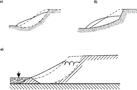 Рис. 6.3. Формы потери общей устойчивости откосов в виде обрушения со срезом: Нарушение местной устойчивости откосов характеризуются смешением отдельных участков поверхности откосов [55]. Это - деформации локального характера, хотя иногда они могут охватывать и достаточно большие площади. Основные их формы приведены в табл. 6.3. Таблица 6.3