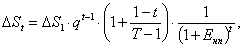 N 1 - интенсивность движения транспортного потока (или приведённая к расчетному легковому автомобилю при доле легковых автомобилей в транспортном потоке более 0,3) в первый год после ремонта дороги, авт/сут; NСНиП - то же, по СНиП 2.05.02-85; q - показатель роста интенсивности движения во времени (q > 1). Эффект от работ по усилению дорожных одежд, устройства выравнивающих слоев с поверхностной обработкой (фактор Кpc 6) и устранения колейности на проезжей части (фактор Кpc 9) рассматривают в соответствии с ВСН 41-88 на период Т = 3-20 лет, но не более tPEK. Эффект от устройства поверхностных обработок (фактор Кpc 7) определяют исходя из норм межремонтных сроков службы дорожных покрытий (см. ВСН 41-88) Тп = 2-8 лет в зависимости от интенсивности движения, типа дорожной одежды и региональных условий. Транспортный эффект, учитывающий межремонтные сроки службы, рост интенсивности движения, изменение состояния покрытия во времени и отдалённость затрат в любой t -тый год эксплуатации: