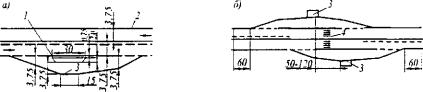 Рис. 12.8. Направляющие тумбы или столбики с отгибами: Особое значение имеет оборудование пересечений дорожными знаками и устройство разметки. Все знаки на пересечениях и примыканиях (кроме предварительных указателей направлений на пересекаемой дороге) устанавливает дорожная организация, которая обслуживает дорогу высшей категории, а при их одинаковой категории - организация, обслуживающая дорогу, интенсивность движения по которой больше, чем на пересекаемой (примыкающей) дороге. От 20 до 40 % протяжённости старых существующих дорог проходят через населенные пункты. На таких участках отмечается повышенное количество ДТП, из которых 51 % - наезды на пешеходов, 9 % - наезды на велосипедистов и 7 % - наезды на автомобили, стоящие на обочине. Наиболее эффективной мерой повышения безопасности движения является строительство обходов городов и населённых пунктов. Кроме того, успешно применяют: устройство с одной или обеих сторон дороги тротуаров, велосипедных дорожек, а также пешеходных переходов; оборудование автобусных остановок и стоянок автомобилей около мест общественного пользования (магазинов, столовых, кинотеатров и т.д.); перевод местного или транзитного движения на параллельные улицы; освещение дороги в пределах всего населённого пункта или на наиболее опасных участках. Тротуары и пешеходные дорожки устраивают на всех участках дорог, проходящих через населённые пункты, независимо от интенсивности движения пешеходов и автомобилей, а на подходах к населённым пунктам и в зонах, расположенных вблизи населённых пунктов при количестве пешеходов, превышающем 100 чел./сут. Пешеходные дорожки устраивают за пределами обочин не ближе 2,7 м от кромки проезжей части. Ширину тротуаров и пешеходных дорожек принимают не менее 1,5 м, поперечный уклон - 15-25 ‰, продольные уклоны - не более 80 ‰. Островки безопасности для остановки пешеходов устраивают на наземных пешеходных переходах при интенсивности движения транспортных средств не менее 400 ед./ч на одну полосу проезжей части и расстоянии между тротуаром и краем островка не менее 7,5 м с помощью разметки, а при расстоянии не менее 10,5 м островки могут дополняться защитными элементами. При интенсивности движения 2000 авт./сут и более, а велосипедистов и мопедов 250 ед./сут необходимо устраивать велосипедные дорожки. Длина велосипедных дорожек на подходах к населённым пунктам в зависимости от численности населения составляет: Численность населения, тыс. чел. 50-100 25-50 10-25 < 10 Длина велосипедной дорожки, км 6-8 4-6 3-4 1-3 Велосипедные дорожки располагают в пределах полосы отвода на расстоянии не ближе 2,4 м от кромки проезжей части. Ширина для велосипедных дорожек для однополосного движения – 1 м, для двухполосного разностороннего движения 2 м; продольный уклон до 30 ‰, максимальный на коротком участке - 60 ‰. Автобусные остановки в пределах населённых пунктов располагают около магазинов, столовых и других мест общественного пользования примерно через 1 км одну от другой. Автобусные остановки размещают на прямых участках дорог и кривых в плане радиусом не менее 1000 м с уклоном не более 40 ‰. На участках подъёмов автобусные остановки располагают на вершине подъёмов с устройством уширений или на расстоянии 250 м до начала подъёма. На дорогах I категории остановки размещают одна напротив другой с устройством подзе