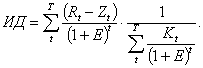 Rt - эффект от снижения числа ДТП в году t; Zt - текущие затраты в году t; Кt - единовременные затраты в году t; Е - норма дисконта; Т - момент окончания расчетного периода. Индекс доходности ИД